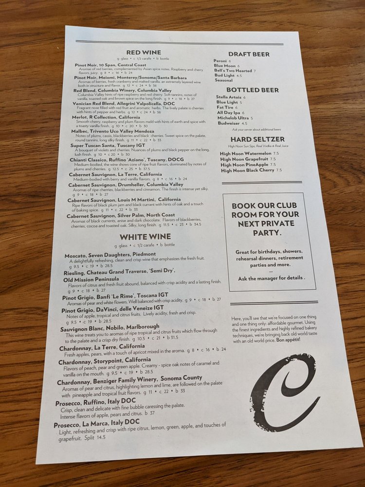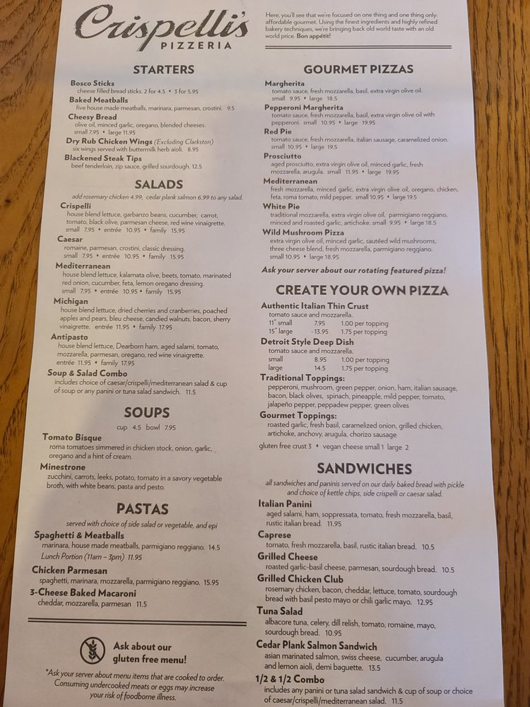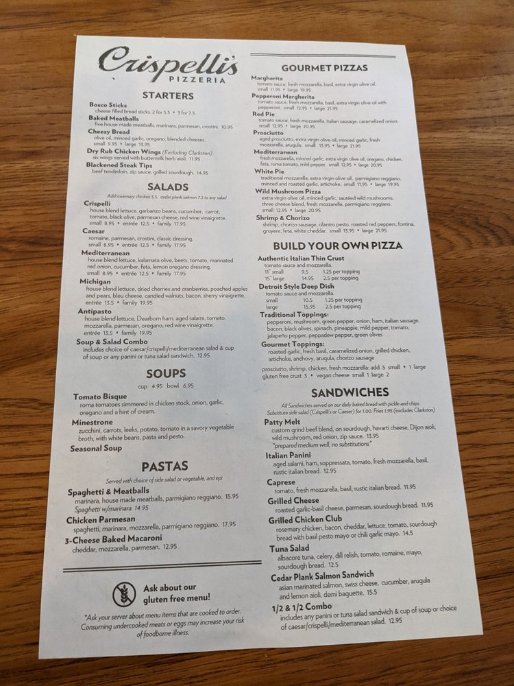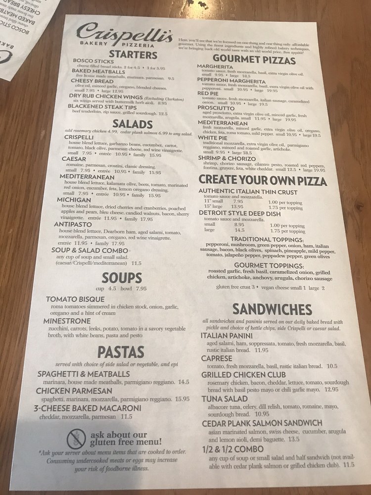 Introducing the menu at Crispelli’s Bakery & Pizzeria, located in Berkley, MI, brings a delightful selection of salads, soups, and pizzas for all food enthusiasts. The salads range from a classic Caesar to a flavorful Michigan option, while the soups offer comfort with choices like Tomato Bisque and Minestrone. The highlight of the menu is the pizza, where the Deep Dish Detroit Style and Authentic Italian Thin Crust stand out as crowd favorites. Customers rave about the quality and taste of the dishes, with reviews praising the generous portions and fantastic flavors. With options for gluten-free, vegan, and vegetarian diets, Crispelli’s caters to a diverse range of preferences. The welcoming atmosphere and attentive service add to the overall dining experience, making it a must-visit spot for a satisfying meal.
